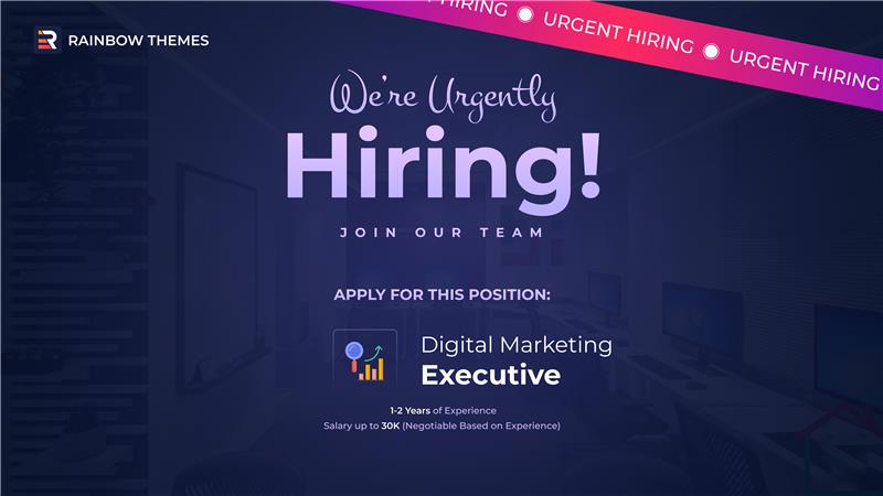 Rainbow-Themes is hiring a Digital Marketing Executive to drive brand awareness, online engagement, and sales for our products. This is a great opportunity to work in a fast-paced, creative environment where you’ll strategize and execute marketing campaigns, optimize SEO, and manage social media presence. If you’re passionate about digital marketing and want to grow your career, we’d love to hear from you!